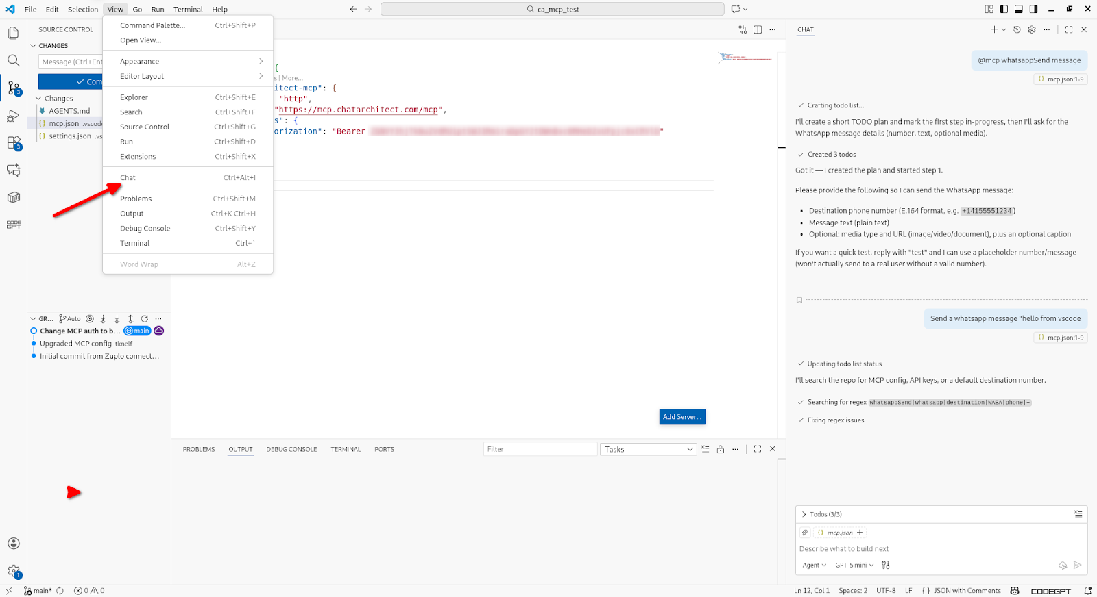 In this example, the model is granted access to the MCP server, which enables sending WhatsApp messages.